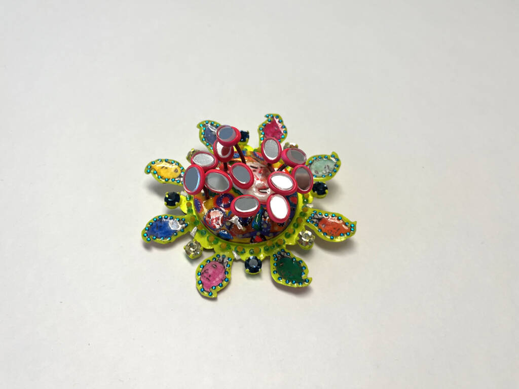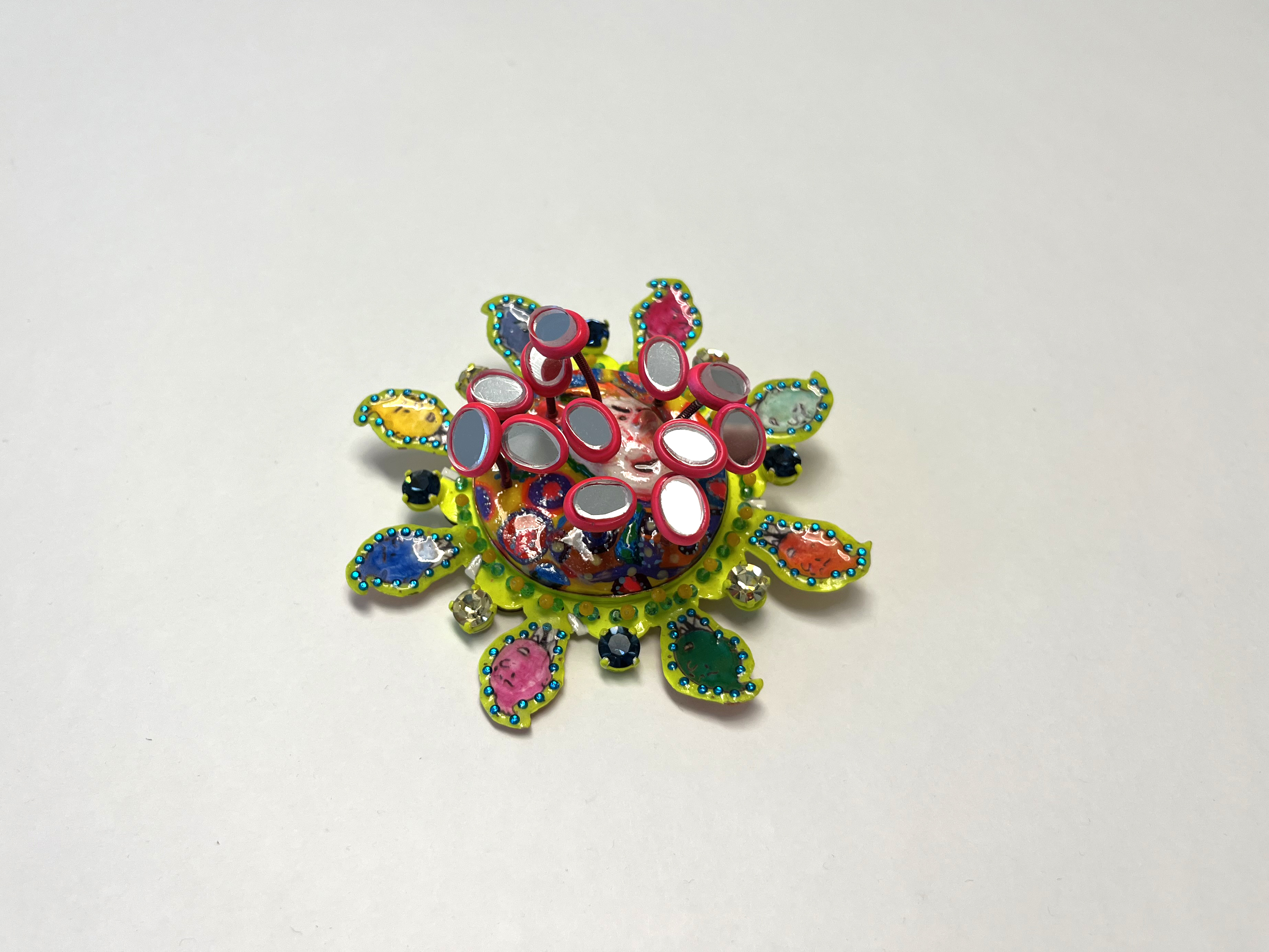 Coco Sung, An Effort Not to Become a Narcissist „TIN TIN“, 2025, Brosche, weißes Kupfer, gelbes Kupfer, Spiegel, Swarovski Steine, Perlen, Garn, Stickerei, Färbung